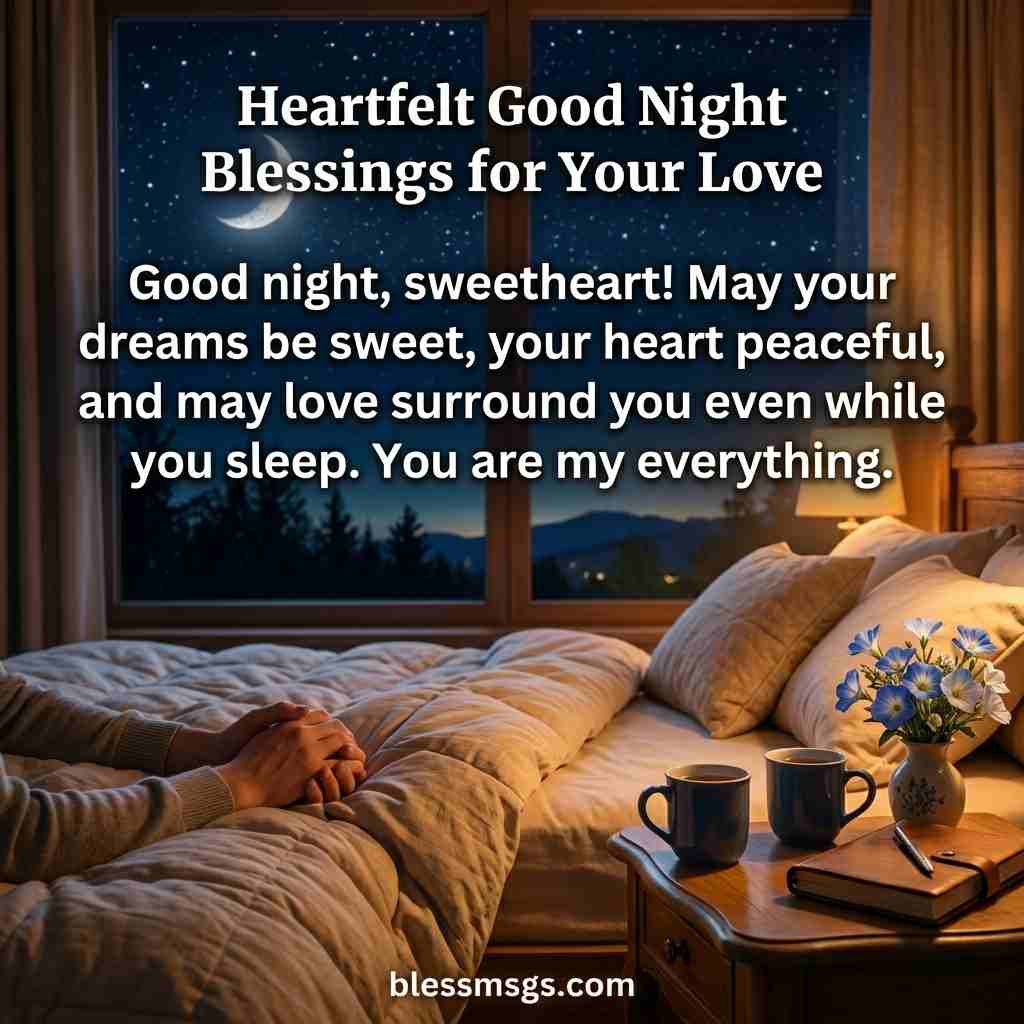 Ending the day with love can make your sweetheart feel secure and cherished. Heartfelt good night blessings are a perfect way to convey care, affection, and emotional closeness before sleep.