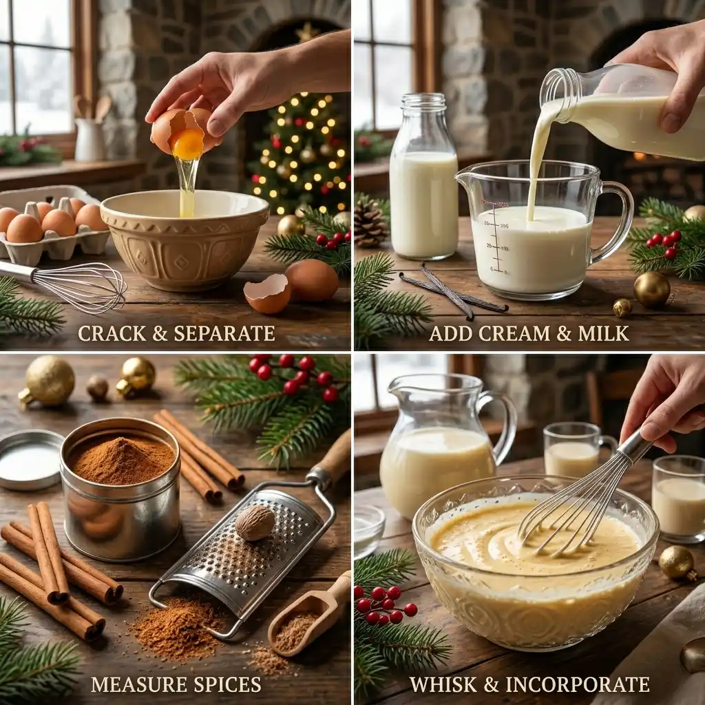 Eggnog is made from milk, cream, eggs, sugar, and spices like nutmeg and cinnamon. Some versions also include alcohol, but non-alcoholic versions are common.